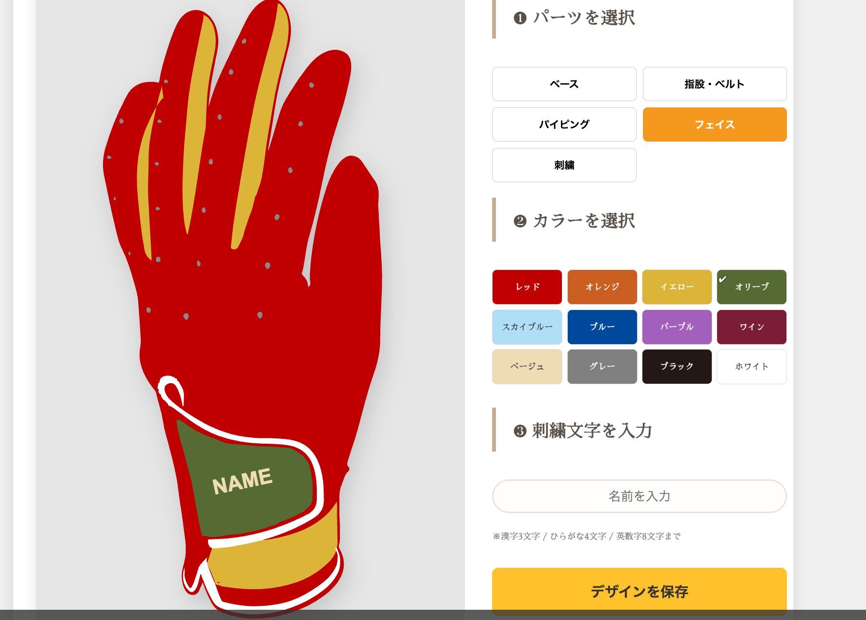 プレミアム カラーシュミレーター 未分類Screenshot 2026/1/10 ゴルフグローブ・シミュレーター NAME ①パーツを選択 ベース 指股・ベルト パイピング フェイス 刺繍②カラーを選択③刺繍文字を入力 ※漢字3文字 / ひらがな4文字 / 英数字8文字まで デザインを保存
