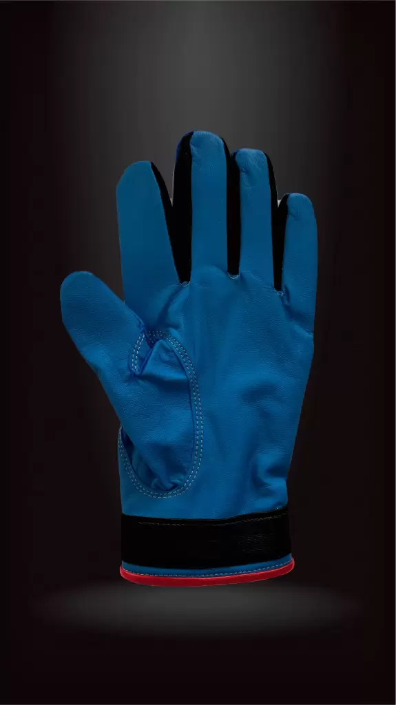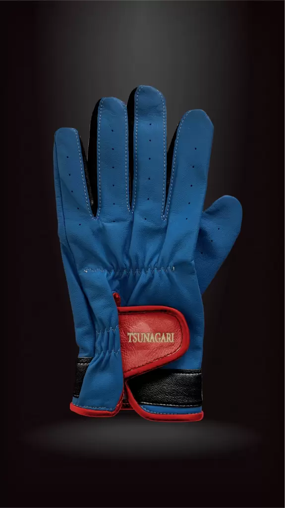 ベースに[ブルー]、指股とベルトに[ブラック]、パイピングとフェイスに[レッド]、刺繍に[ベージュ]の構成です。深い[ブルー]が信頼と落ち着きを表し、[ブラック]が輪郭を引き締め、[レッド]が節目の意志を明るく映します。仕上げの[ベージュ]が温かい余韻を添え、静かな風格を手元に残します。