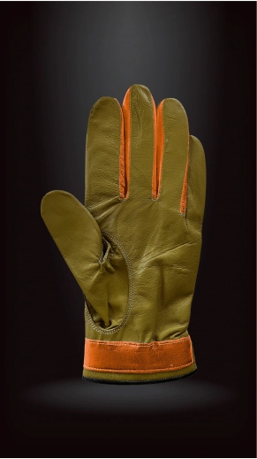 オリーブ×オレンジという温かみのある対比に、グレーが都会的な余白を生み出しています。スカイブルーの刺繍は軽やかな印象を添え、ブラックのパイピングが全体を上質に引き締めます。誕生日の贈り物として、非常にバランスの良い配色です。